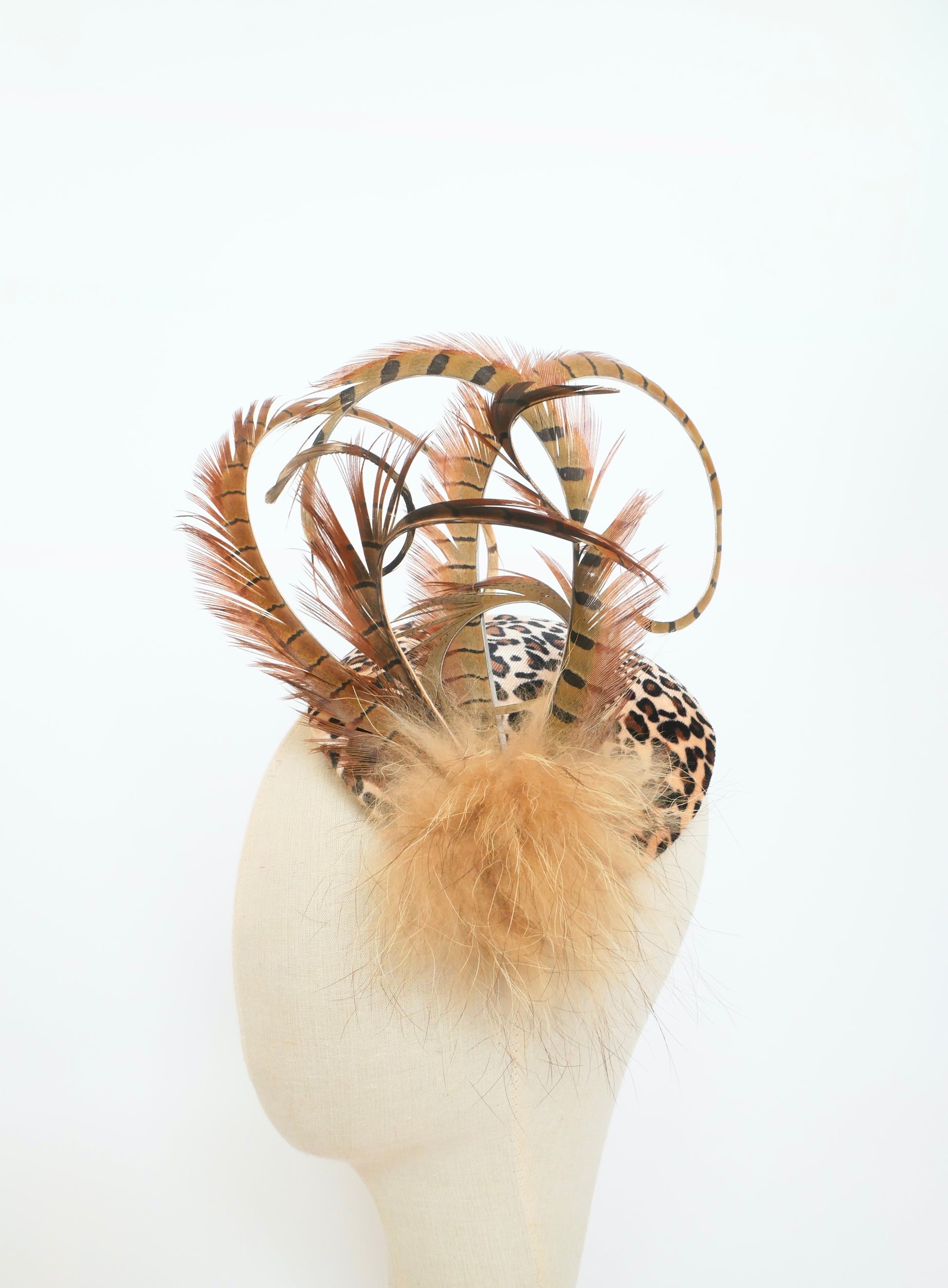 Handmade leopard print fascinator with vintage fur and feathers fascinator perfect for a winter wedding and Cheltenham race meeting.